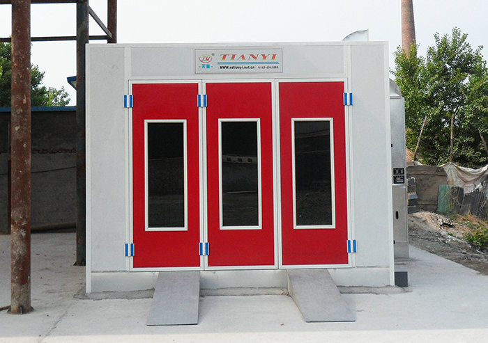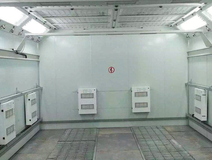 整个喷烤房为拼装式结构,房体采用子母插式保温喷塑墙板,密封、保 温性能好,铝合金包边大门,门中间装有观察窗,可随时观察房内动态;房体侧面装有工作门,方便工作人员进出,不锈钢热交换器,换热效率高,使用寿命长;选用进口过滤棉、低噪音高风量风机,确保喷漆效果。喷漆房为工件喷涂提供:(1)洁净的工作环境;(2)充分收集漆雾。 喷漆房的配置按工件大小、形状、重量及生产纲领可有多种方式:有开式、闭式之分;有连续式、间歇式之分;有工件自转或固定之分;有单侧喷涂及双侧喷涂之分。近年又发展出油帘喷漆室、下喷漆房等。结构上应包括:送风过滤系统、工件吊挂(输送、自转)装置、水帘系统、水洗系统、排风系统、水槽、照明装置及室体。 漆雾回收的原理:漆雾回收可分成二个部分:一是喷涂工件时,漆雾与水帘碰撞混合,水帘会溶入部分漆雾落入水槽;二是未溶入水帘的漆雾经水帘板底部缝隙进入水洗室,与雾化喷嘴喷出的水雾充分混合,气水分离沉降后流入水槽。在水槽中定期加入漆雾凝聚剂形成漆渣。